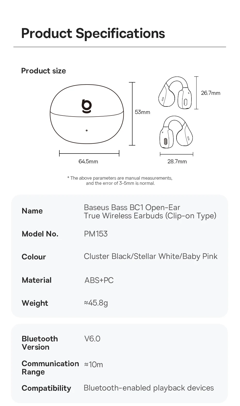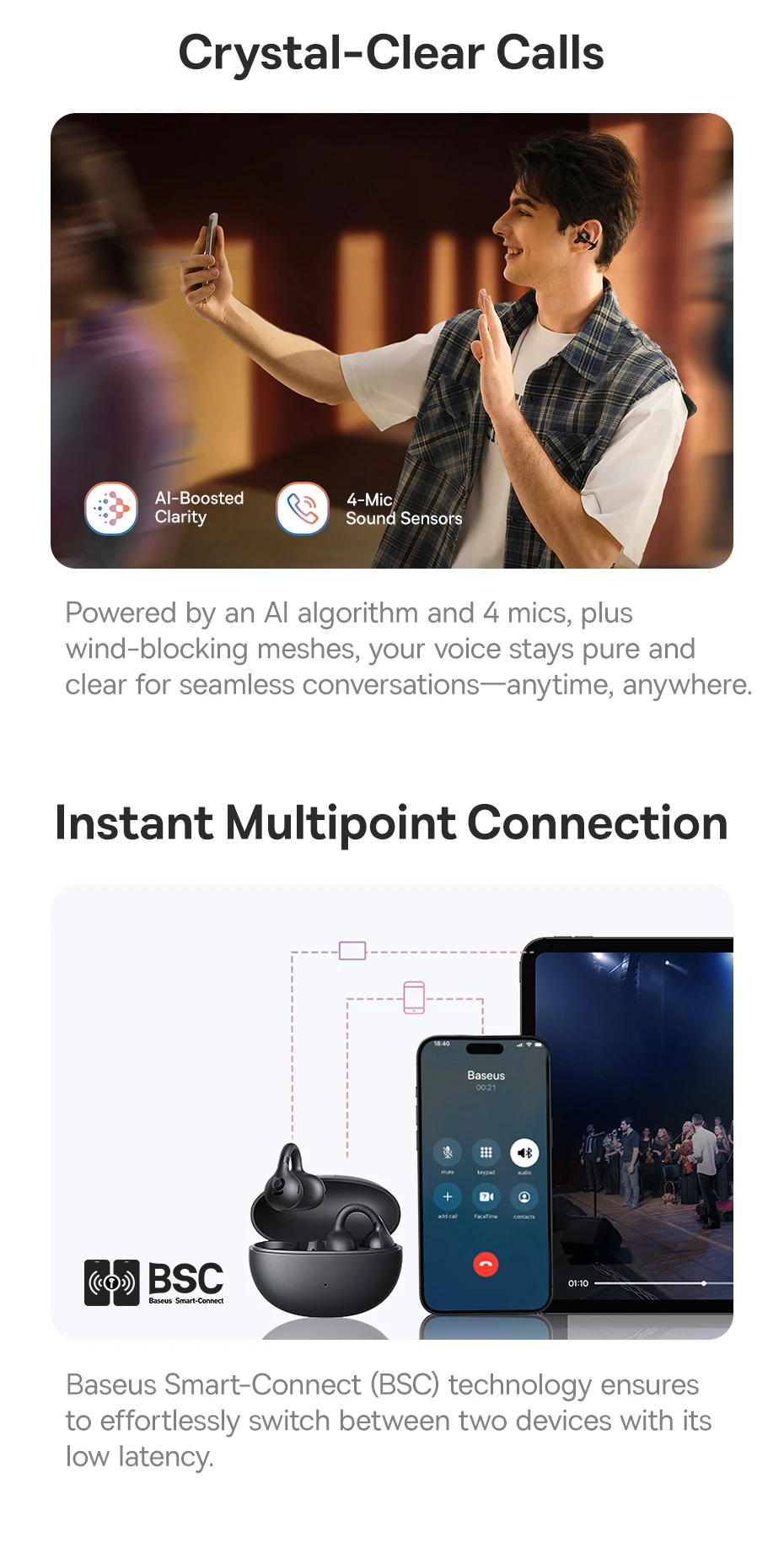 Fones de ouvido sem fio verdadeiros de orelha aberta Baseus Bass BC1