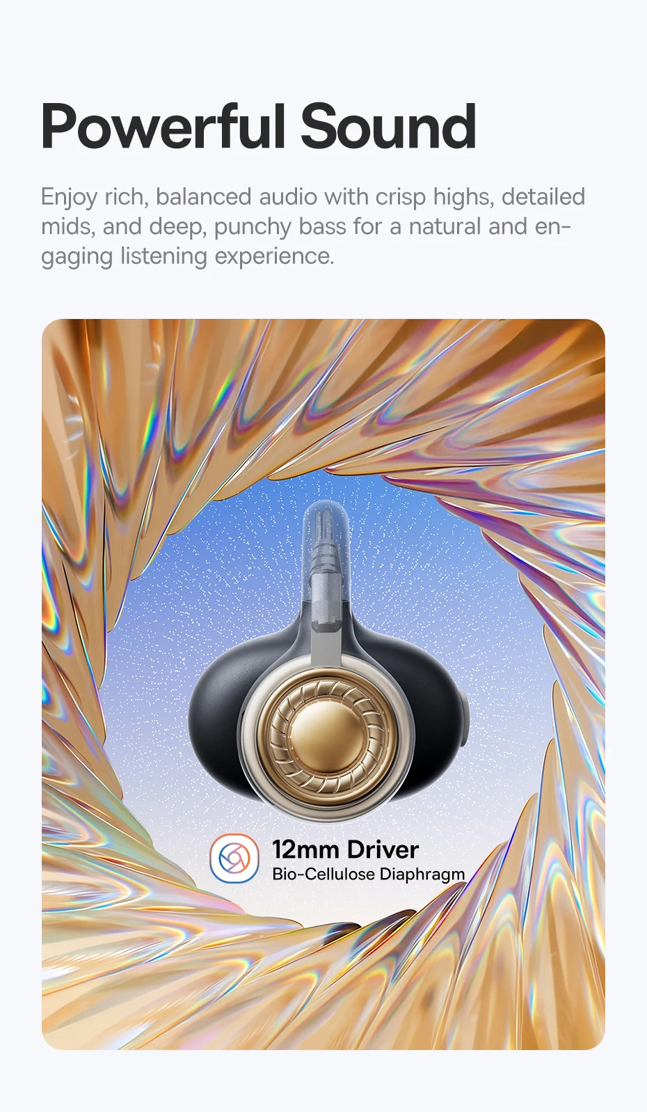 Projetado para conforto duradouro, cada fone de ouvido pesa apenas 5,3g, oferecendo uma sensação quase imperceptível para uso o dia todo sem pressão ou fadiga