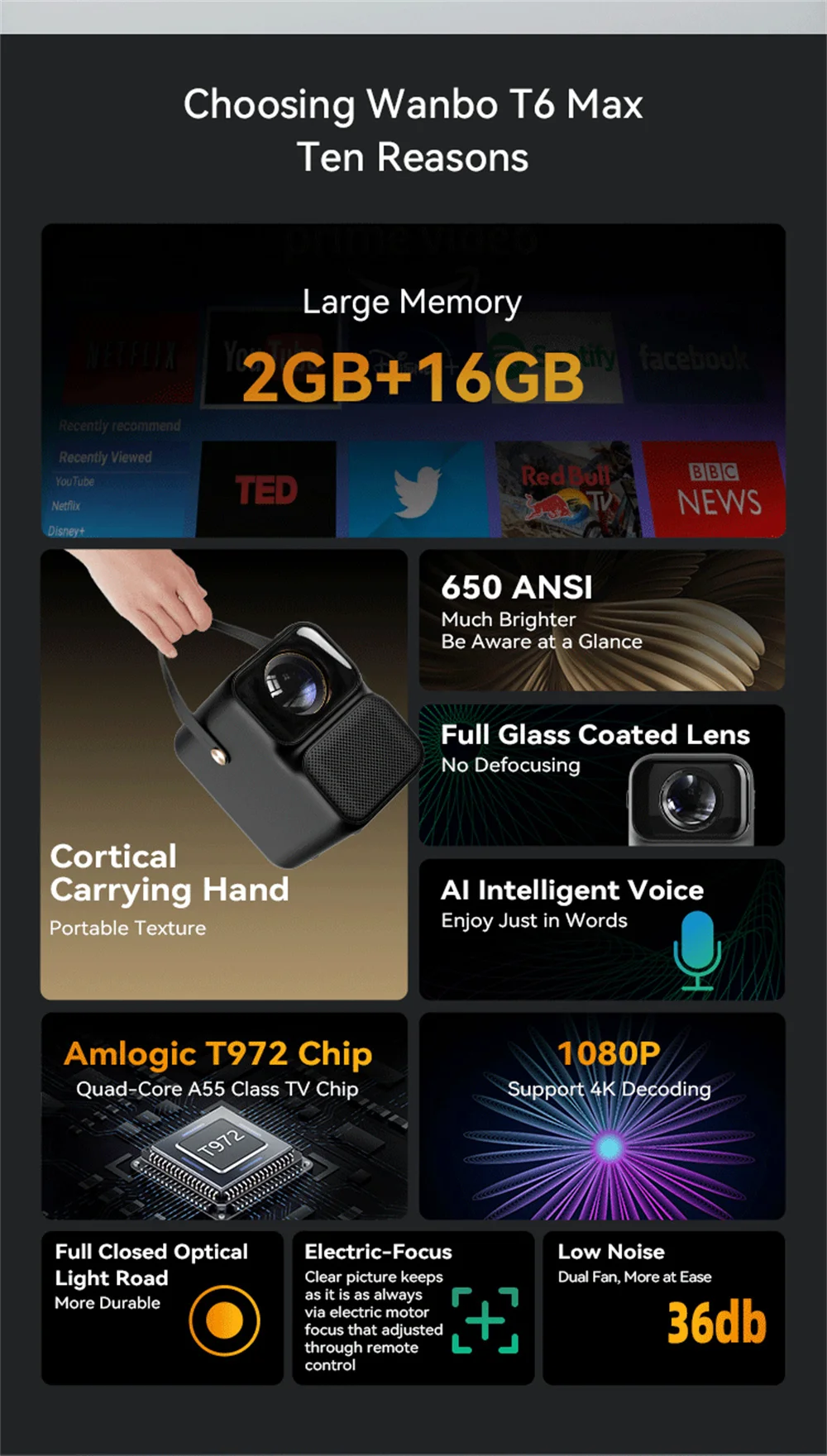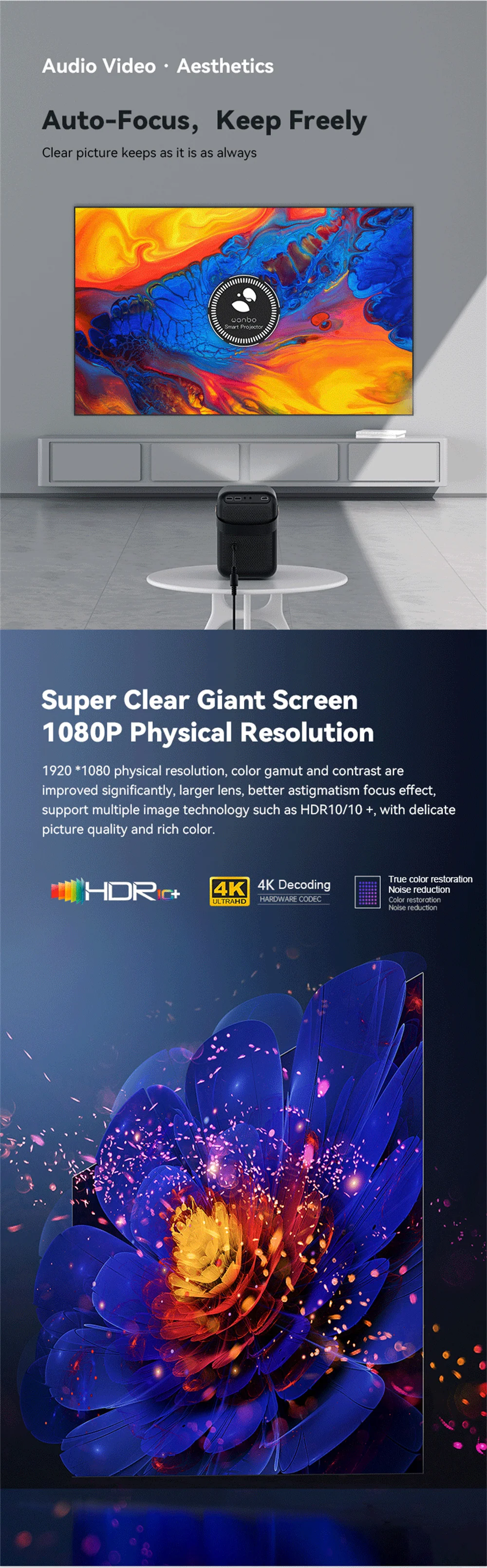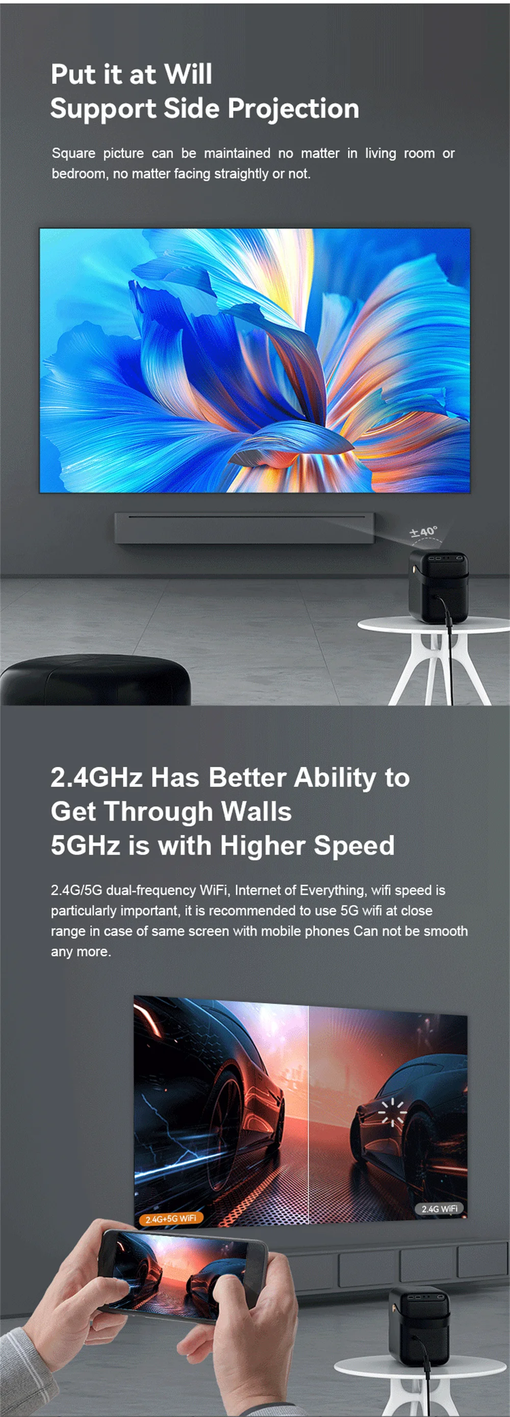 Para atender melhor às suas necessidades, atualizamos o Wanbo T6 MAX com os mais recentes 550 Lumens e a resolução nativa de 1920*1080 (Suporte MAX: 4K). Suporte 2.4G/5G WiFi & BT, assim você pode sincronizar a tela do smartphone por 2.4G e 5G WiFi