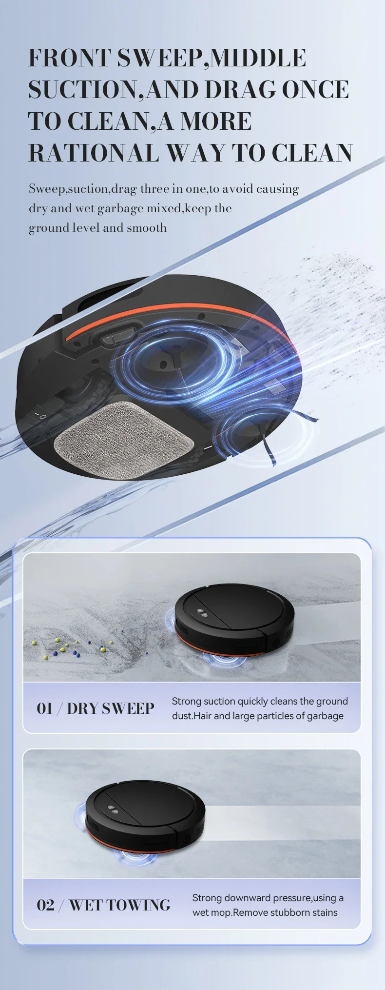3.Varredura frontal, sucção média, esfregão traseiro, limpeza única, método de limpeza mais razoável.Varrer, aspirar e esfregar são três em um, evitando a mistura de lixo seco e úmido e mantendo o solo liso e liso.Varredura a seco, sucção forte para limpar rapidamente poeira, cabelos e grandes partículas de lixo no chão; esfregão úmido, forte pressão descendente, use esfregão úmido para remover manchas teimosas