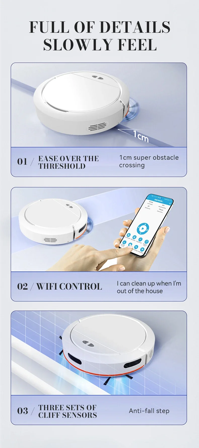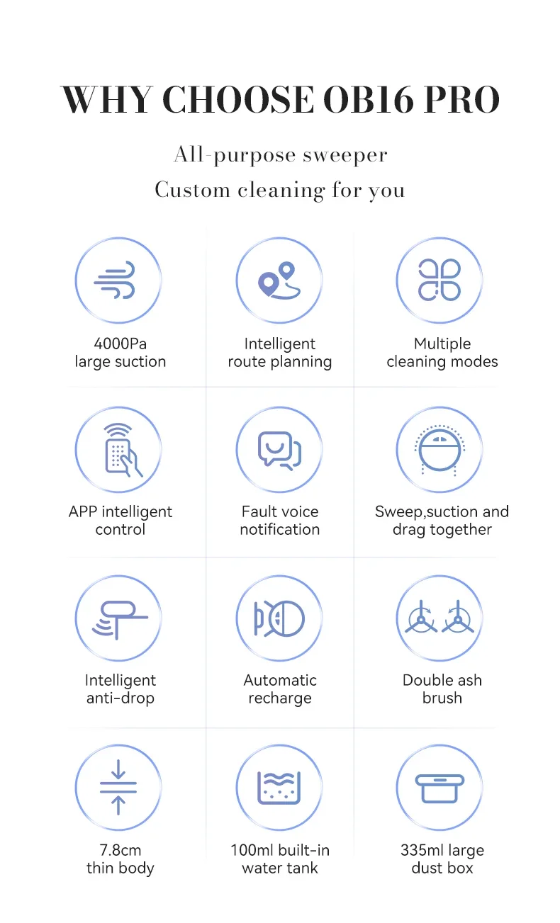 1.Alta potência de sucção de 4000pa, planejamento de rota inteligente, vários modos de limpeza, controle inteligente de APP, comandos de voz de falha, varredura integrada, sucção e arrasto, anti-queda inteligente, recarga automática, escovas dupla-face acumuladas de poeira, 7.Corpo fino de 8 cm, tanque de água embutido de 100 ml, caixa de poeira extra grande de 335 ml