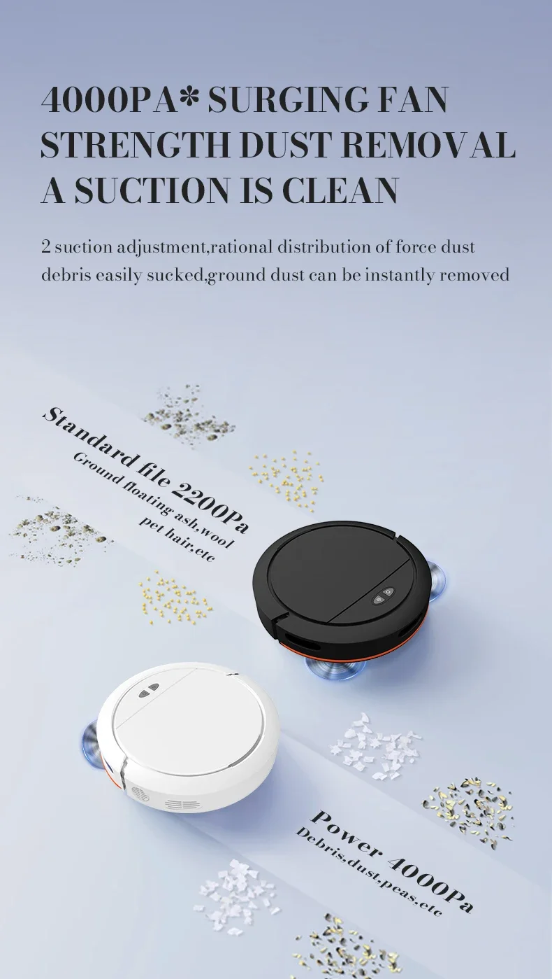4.Ventilador de pico de 4000Pa, remoção poderosa de poeira, limpe com uma sucção.Ajuste de sucção de 2 níveis, distribuição racional de potência, fácil sucção de detritos flutuantes, a poeira do solo pode ser retirada instantaneamente
