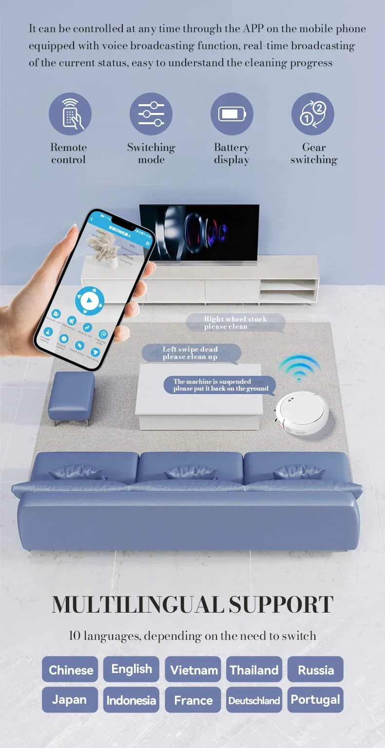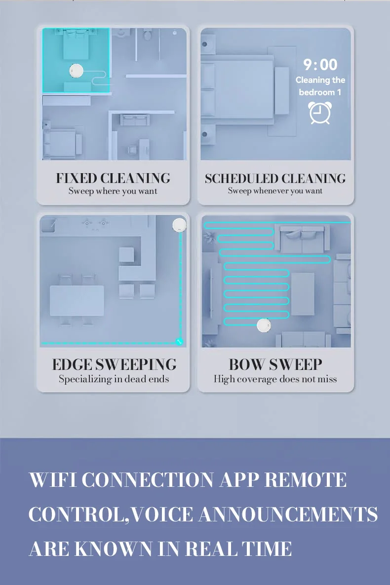 8.Controle remoto do aplicativo Wifi Link, transmissão de voz, consciência em tempo real.Pode ser controlado a qualquer momento no celular através do aplicativo e está equipado com uma função de transmissão de voz para transmitir o status atual em tempo real, facilitando a limpeza do progresso.Controle remoto, modo de comutação, display de energia, interruptor de marcha