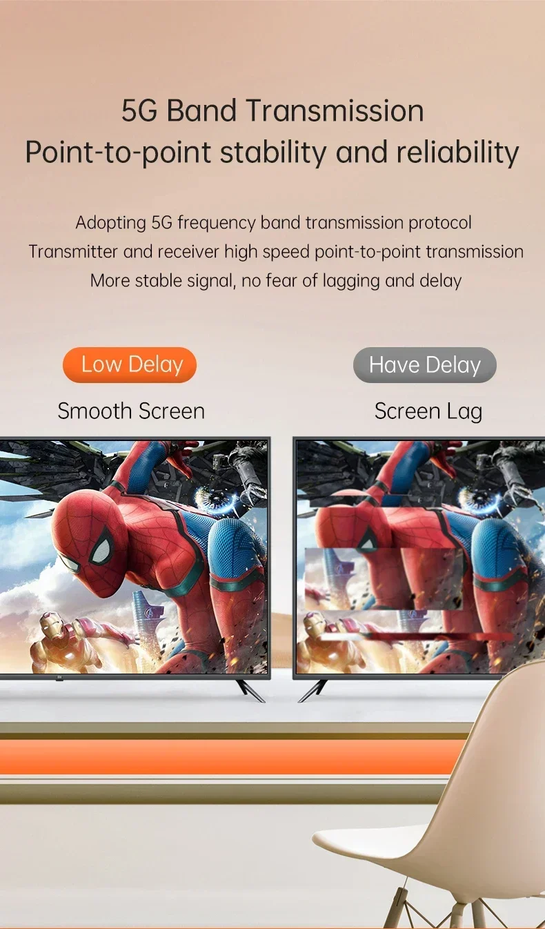?Plugue e jogue?Comece a trabalhar em 20 segundos com uma verdadeira experiência plug-and-play.Conecte o transmissor à fonte HDMI, depois conecte o receptor à HDTV secundária e você estará pronto para começar.Opera no padrão 802.11 5GHz.