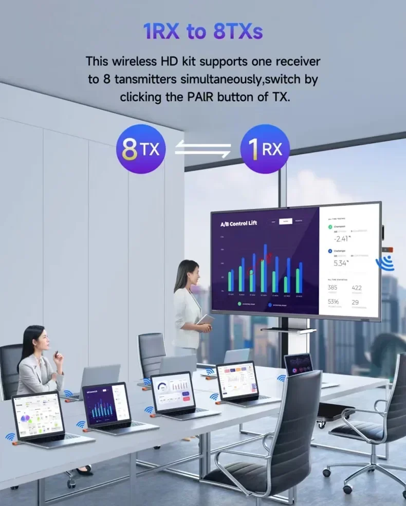 ?Modo Muitos-para-Um?8 transmissores podem ser conectados a 1 receptor ao mesmo tempo, interruptor de um clique, não interferem entre si e várias telas podem ser compartilhadas.*Nota: Esta operação requer a compra adicional de transmissores, e os 1 receptores podem suportar até 8 transmissores.